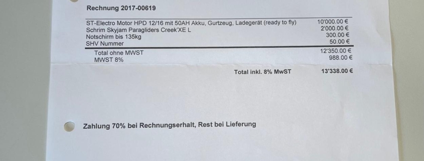Verkaufspreis in CHF: 690Verkaufe nur 3x geflogene Gleitschirmausrüstung mit E-Motor für 75-85kg Das Material ist in einwandfreiem Zustand EmailVerkaufspreis in CHF: verhandelbar